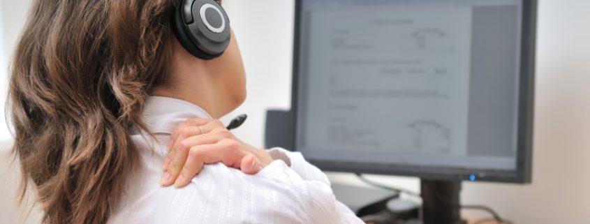 The big tip for you during you working day is to get up from your desk at regular intervals and do a few simple stretches thru you upper back and neck and squeeze you shoulder blades down and together, have a quick walk around – get that cup of tea or glass of water, before sitting back down